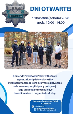 Serdecznie zapraszamy wszystkich kandydatów zainteresowanych służbą w Policji do odwiedzenia naszej jednostki podczas Dni Otwartych, które odbędą się 18 kwietnia (sobota) 2026 roku w godzinach 10:00–14:00. W trakcie spotkania przybliżymy specyfikę służby w Policji, omówimy zadania realizowane przez funkcjonariuszy oraz szczegółowo przedstawimy proces rekrutacji. Będzie to doskonała okazja, aby uzyskać odpowiedzi na nurtujące pytania i dowiedzieć się, jak wygląda codzienna praca policjanta.